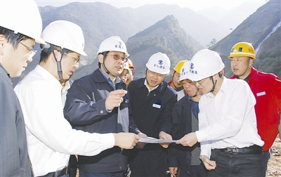 二滩公司总经理、党委书记陈云华(左三)在官地水电站建设工地检查指导工作