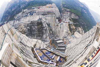 建设中的雅砻江锦屏一级水电站大坝。该坝高305米,为当前世界最高双曲拱坝。