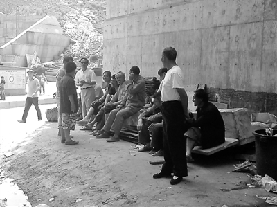 5月5日,在工地旁边,已欠薪半年的农民工们苦等发放工钱。本报记者 李国 本报实习生 周松 摄