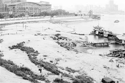 5月5日,长江武汉龙王庙段,岸边大片沙地滩涂裸露,航道狭窄。时值五月上旬,因受长江上游来水减少影响,长江武汉段水位持续偏低。承影 摄
