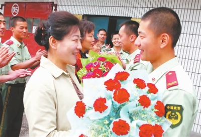 5月7日,战士们向来到警营的母亲献上鲜花表达节日祝福。