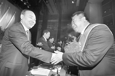 5月8日,中平能化集团公司矿工俱乐部广场上,集团公司18名领导在风中列排静候劳模的到来。当天,中平能化集团公司表彰劳模。据介绍,此次获奖的205名劳模中有202名是普通职工。图为董事长梁铁山向劳模颁奖。陆新义 楚勋涛 摄