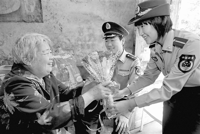 5月8日,福建长乐漳港公安边防派出所民警向李坤金老人献花。