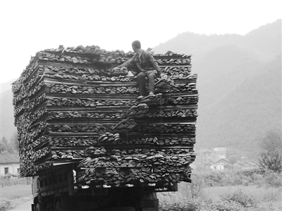 在浙江开化县的一条乡村公路上,一辆满载木板的农用车正吃力地行驶。让人吃惊的是,高高的木板上竟然还悬空坐着人。