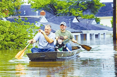 美国近日强降水致使密苏里州、伊利诺伊州、肯塔基州、田纳西州和阿肯色州遭遇洪灾。图为5月7日在田纳西州,一户居民划着小船逃离家园。吉平 供图