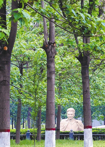 兰考群众在1963年焦裕禄同志亲手栽植泡桐的地方树立了一座焦裕禄塑像。当年的小树苗已长成了参天大树(2009年5月14日摄)。新华社记者 王颂 摄