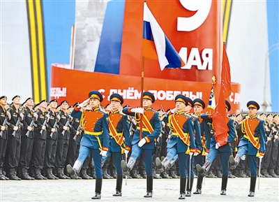 5月9日,在俄罗斯首都莫斯科举行的纪念卫国战争胜利66周年阅兵仪式上,士兵护送俄罗斯国旗从红场走过。新华社记者 刘力航 摄