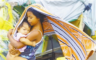 5月9日上午,今年第一号热带风暴“艾利”的中心在菲律宾吕宋岛东部沿海登陆,菲律宾官方最新灾情通报说,“艾利”已造成当地22人死亡,11万多人受灾。图为在首都马尼拉一处临时安置点内,一名女孩在大风中抱着幼小的孩子。吉平 供图