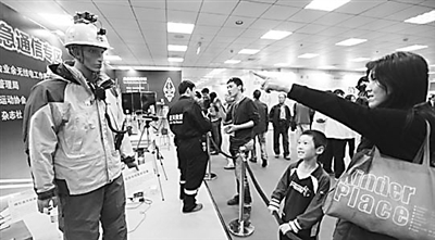 5月8日,为期3天的第二届北京国际减灾应急技术与设备博览会在北京中国国际贸易中心开幕。图为家长面对展品给孩子讲解无线电通信知识。新华社发(罗伟 摄)