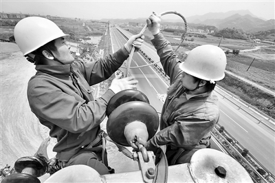 在浙江省诸暨市,活跃着一支传递“诚信、责任、创新、奉献”国网服务文化的“明诸”电力党员服务队,他们行走街头巷尾、奔波田间地头,服务经济发展、开展便民服务,用实际行动实践着“明亮诸暨,增辉党旗”的誓言。图为诸暨市电力局党员服务队员为茶农架设供电线路。王列刚 姚理松 摄