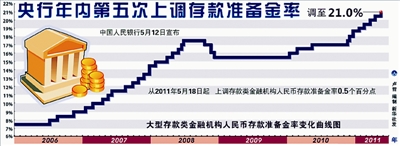新华社北京5月12日电 (记者王宇 王培伟)距离上一次上调存款准备金率不到一个月时间,中国人民银行决定,从2011年5月18日起,再度上调存款类金融机构人民币存款准备金率0.5个百分点。