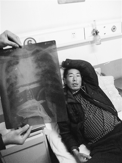 冯术雨掀开自己的上衣,两个孔状的伤疤赫然显露在右肋上方和左部肺叶上方,那是他呼吸困难时接受急救手术留下的痕迹。他告诉记者,输氧管曾直接插入他的肺部。