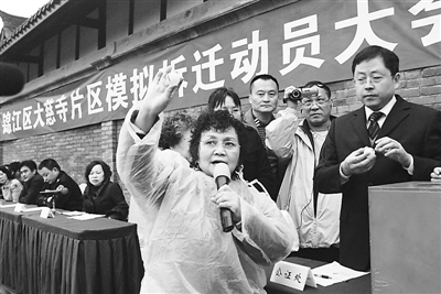 成都锦江区居民冒雨出席模拟拆迁动员大会,表达拆迁意见