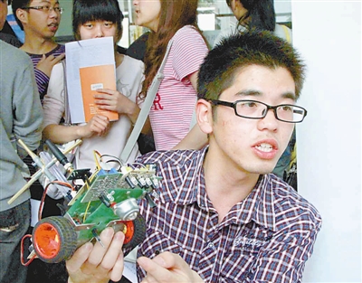 5月13日,浙江师范大学举办的2011年理工科专场招聘会上,浙师大数理信息学院学生邵龙向招聘人员介绍他的小发明成果——智能绘图小车的使用性能。当日的理工科专场招聘会上,全省近百家企事业单位带着800多个就业岗位前来学校挑选毕业生。前来应聘的部分学生带着设计成果与招聘单位洽谈就业意向。葛跃进 陶玉其 摄