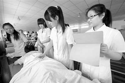 5月15日,盲校毕业生在招聘会上展示推拿技能,接受用人单位测试。