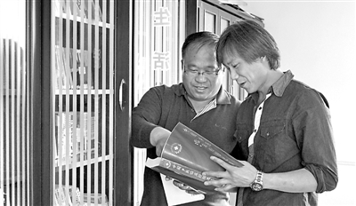 内蒙古包头市九原区麻池村草原书屋的管理员(左)在给农民介绍图书(5月15日摄)。