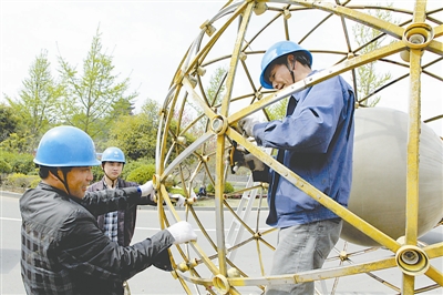 “5·19”是中国旅游日,宁波宁海供电局组织精兵强将,再一次对城区所有的路灯、景观灯进行了检修和加装,为中国旅游日添红着彩。图为职工们正在徐霞客大道精心安装“珍珠灯”。