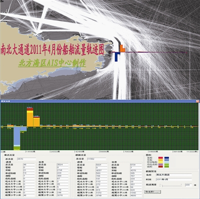 航运业承担了全球贸易中90%以上的货物运输量,因此成为世界经济的晴雨表。AIS系统存储了大量的船舶位置报告,自动生成船舶进出港、航道船舶航行轨迹信息(如上图中的白色线条),利用船舶轨迹流量统计软件,可以非常便捷地对区域、港口船舶航运动态统计分析,进而对全球或区域经济活跃度评价、贸易供求分析、危机预警,以及宏观经济监测与决策等提供第一手数据。中国AIS管理中心向记者提供的资料中,就包括了金融危机以来秦皇岛港主航道船舶进出港流量的全部数据。据悉,中国AIS岸基系统已储存了我国船舶动态的完整数据。黄何副局长称:“中国水上物联网已领先于陆地,且走在了全球前列。”