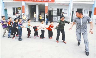 5月15日,在江西九江博爱聋校,肢残人杨美华老师(右二)和她的儿子何明老师(右一)带着学生做游戏。