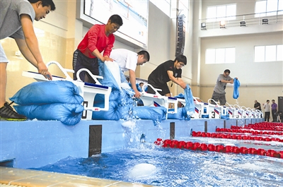测试前,工作人员往泳池中加冰块降水温。王运 摄