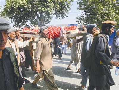5月18日,在阿富汗塔哈尔省首府塔卢坎,阿富汗民众抬着遇难者遗体参加示威活动。