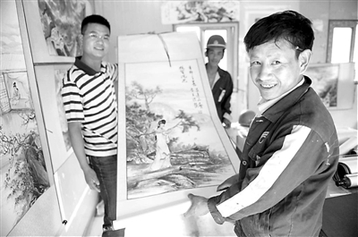 马进山执意要将一幅刚完成的新画送给自己的老板,以感谢他对自己绘画的支持(5月19日摄)。近日,从甘肃陇南来青岛打工的马进山正紧张地筹备个人画展,与其它画展不同的是建筑工地就是他的展厅,而工友就是他最忠实的观众。