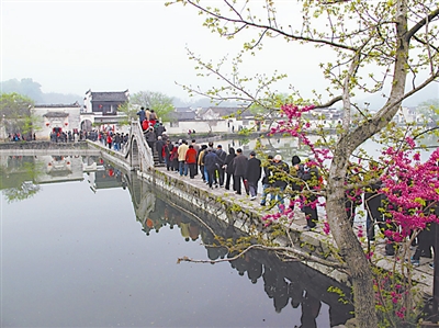南湖是宏村的门面,水清如镜,临湖就是一排错落有致的农舍,青瓦粉壁马头墙,典型的徽派民居。站在南湖南岸,左有西溪缓缓,右有东山绵绵,前望雷岗葱郁,蓝天清明,四面都是景致,八方皆有韵味。到这里游人如织,久久流连,更有成群的美术学院师生坐在岸边,细细地端详,静静地欣赏,一边思考一边或徐或急地挥动画笔,记录下他们各自心中的宏村。