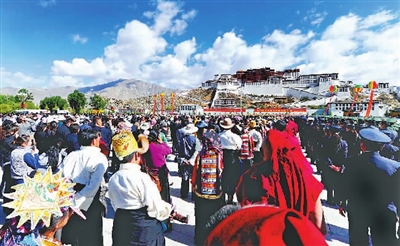 今天的布达拉宫广场彩旗飘扬,到处是欢声笑语。上午10时,英姿飒爽的国旗护卫队迈着整齐的步伐走进广场。在雄壮的中华人民共和国国歌乐曲声中,一面鲜艳的五星红旗冉冉升起,在场的各族各界群众齐声唱响中华人民共和国国歌。