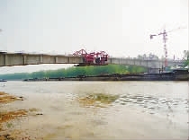 由中铁十一局集团二公司担负施工的宿淮铁路京杭运河特大桥,全长3273米,共有99个台墩,主跨25、26号墩之间为跨径达132米的连续梁钢管拱桥,此乃我国国内单线铁路最大跨度连续钢管拱桥桥梁,堪称为“神州第一跨”,被铁道部列为2011年度重点科技开发项目。(图/文:林赤喜 邓捷 张荣文)
