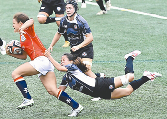 5月21日,中国香港队球员娜达莎(左)进攻时遭遇新加坡队球员的拦截。当日,15人女子橄榄球友谊赛在香港足球会举行,中国香港队以53比8战胜新加坡队。新华社记者 卢炳辉 摄