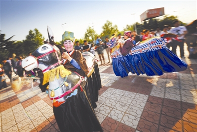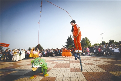 5月14日下午5时许,巍峨的泰山脚下,山东省新泰市青云湖广场上微风轻拂,春意盎然。一组清脆优美的锣、鼓、钗、唢呐等乐器合奏过后,身着古装手提旱船的演出队伍便粉墨登场。众演员行至场子中央,两位没有化妆的老者双手抱拳拱手向观众行礼,然后高喊一声“演出开始!”,尔后,一场分别被列为我国国家级和省级非物质文化遗产的传统经典剧目独杆跷“刘海戏金蟾”和百兽图“八仙过海”在一阵阵掌声中渐入高潮……两位老者一位叫王宗禄,68岁,领衔独杆跷,另一位叫张传霞,79岁,领衔百兽图,并分别属于两个门类的第5代传人和第4代传人。