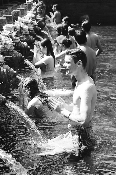 5月26日,一名外国游客在印度尼西亚巴厘岛的圣泉寺内和当地人一起沐浴泉水祈福。印尼巴厘岛今年1季度接待外国游客同比增长10.7%。