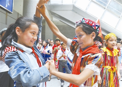当日,来自南疆的50名少先队员抵达乌鲁木齐,与乌鲁木齐50名少先队员共同迎接“六一”国际儿童节。 新华社记者 王菲 摄
