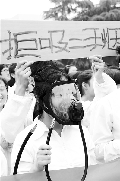 5月28日,西安交通大学的学生头戴防毒面具宣传控烟。