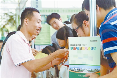 5月29日,浙江省德清县2011创业项目展示现场吸引了许多青年前来参观洽谈。这次创业展示共展出大学生自主创业等参展项目60个,许多项目的初期投资只需3万到5万元,适合全民小额投资创业。李剑民 摄