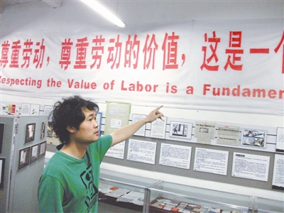 一幅红底白字的横幅悬挂在正门展厅的墙上,“尊重劳动,尊重劳动的价值,这是一个民族最基本的道德。”语出国务院总理温家宝。横幅的下方,从二手市场淘来的玻璃展柜里,摆放着500多件展品:票据、证件、罚款单、押金条、白条、保安工服以及皱巴巴的红头文件。