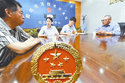 河北廊坊开发区法院注重于以调解方式解决当事人纠纷,维护社会的稳定与和谐。他们推行“全程式调解模式”,在案件的立案、审理等各个阶段,在调解志愿者、特邀调解员、主审法官主持调解下,力求平息纠纷、案结事了。今年以来,该院民事案件调解率达到86%。图为两位因院落排水产生纠纷的邻居,在民庭法官的耐心调解下言归于好。本报记者 张宪 本报通讯员 李德明 摄