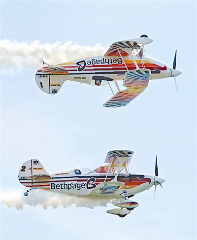 5月28日,在美国纽约长岛琼斯海滩上空,铁鹰特技飞行队做特技飞行表演。当日, 一年一度的“琼斯海滩飞行秀”在这里举行,精彩纷呈的特技飞行表演吸引了众多的游客前来观看。新华社记者 申宏 摄