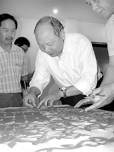 近日,“中国民间艺术之乡”陕西省紫阳县成立了民间艺术协会社区工会联合会,400多名民间艺术爱好者有了自己的工会组织。图为揭牌仪式上,民间艺人现场剪纸“百花贺喜”表达祝贺。