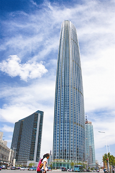 当日,天津市标志性建筑“津塔”挂上了天津环球金融中心的招牌。已建成的天津环球金融中心即“津塔”位于海河之畔,楼高336.9米,地上75层,地下4层,该写字楼借鉴了中国传统折纸艺术形式,是天津第一高楼。 新华社发(王青岩 摄)