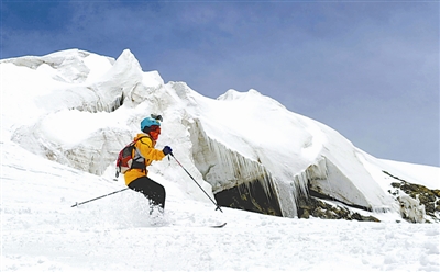 2011年青海岗什卡全国滑雪登山大会5月31日结束,这是中国首次在高海拔地区尝试开展滑雪登山运动。参与本次活动的队员共49名,教练9名。图为运动员从海拔4500米处下滑。白宇 摄