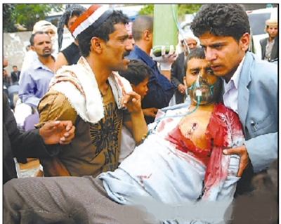 6月1日,在也门首都萨那,受伤的部落武装分子被运走。