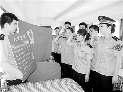 郑州客运段以开展唱红歌、演讲比赛、党建党史知识抢答赛、到革命纪念馆参观等形式多样的活动,迎接建党90周年。图为K1163/1164次列车工作人员在列车上重温入党誓词。陈有会 王艳萍 摄