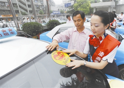 6月5日,参加“爱心送考”的空姐和出租车司机在车身上贴标识。当日,武汉市启动2011年高考“爱心送考”活动,来自全市出租车司机、私家车主等近千名爱心人士报名参加。高考期间,武汉三镇考生均可免费搭乘这些贴有“爱心送考”标识的车辆赶考。 新华社发(史伟 摄)