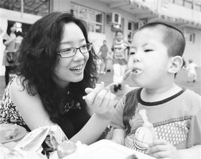 6月6日,一位公司职员(左)在北京朝阳区东方博爱儿童福利院为福利院儿童喂粽子。当日,北京市一些爱心人士自发组织前往北京市朝阳区东方博爱儿童福利院,为这里收留的被遗弃的并且身体大都残疾的儿童带去粽子、学习用品、玩具等礼物,与福利院员工和被遗弃儿童一起过端午节。 新华社记者 陈建力摄