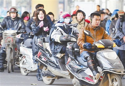 几位郑州市民骑电动车赶路。 新华社记者 王颂 摄