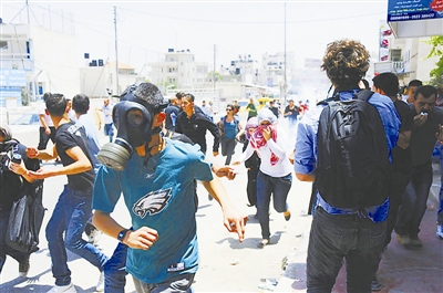 今年6月5日是第三次中东战争爆发44周年纪念日,巴勒斯坦示威者和以色列军队当天再次于多处爆发冲突,造成至少14人死亡。图为在约旦河西岸城市拉姆安拉附近的检查站,巴勒斯坦民众正在躲避催泪弹。吉平 供图