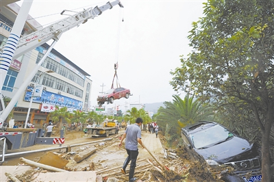 6月7日,起重机在望谟县街头将被洪水损坏的汽车吊起。