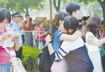 6月7日,在北京市东直门中学门口,一位教师为即将进入考场的学生加油鼓劲。当日是全国高考第一天,今年全国共有约933万名考生报名参加考试,比去年减少约24万名,普通高校招生计划675万名,平均录取率约为72.3%。本报记者 杨登峰摄
