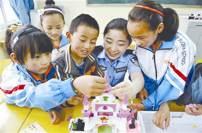 六一儿童节前夕,安徽蚌埠铁路公安处的两位警花徐忠梅和张璋(右二)来到安徽美佛儿国际学校的内地“玉树班”,和这里的19名玉树藏族孤儿共同迎接儿童节,并与他们结成爱心“姐弟、姐妹”,让他们感受到亲情的温暖。新华社记者 郭晨 摄